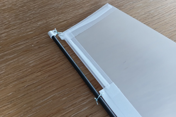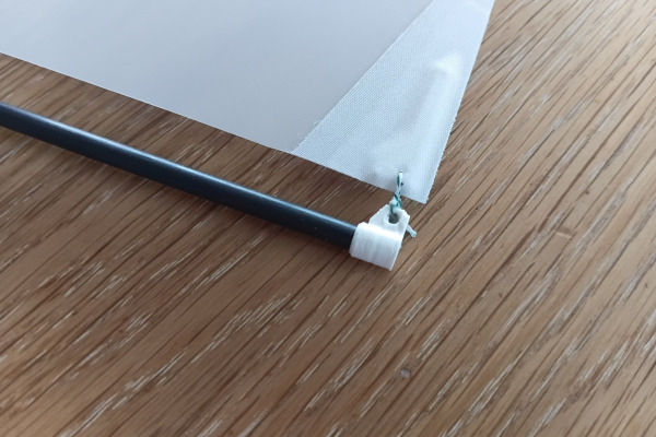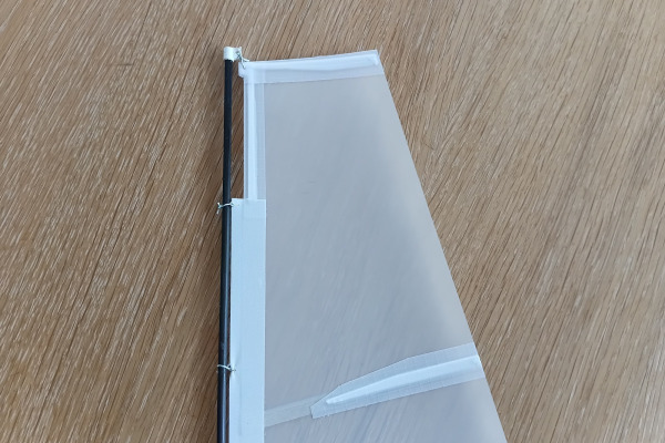 The sail uses printed battens and reinforced corners with integrated eyelets, all simply taped in place with spinnaker tape. Simple, strong, and effective.